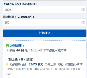 【ブルアカ】強化珠の所持数を入れると装備何個ををレベルmaxに上げられるのか、紫玉何個換算なのか教えてくれるツール