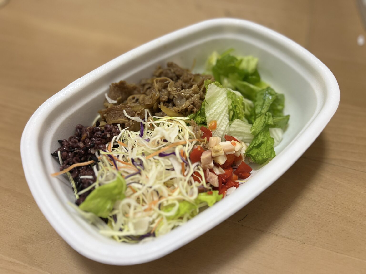 ただのレタスではなく、キャベツや人参、トマトにベーコン、十六穀米とベーコン。豪華なラインナップだ。