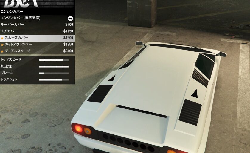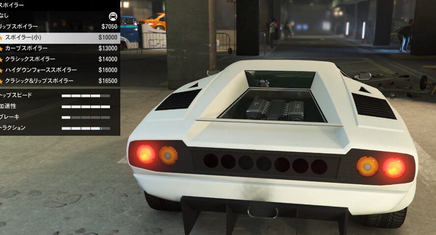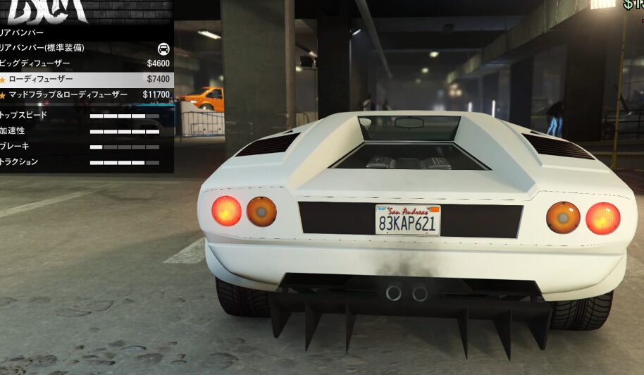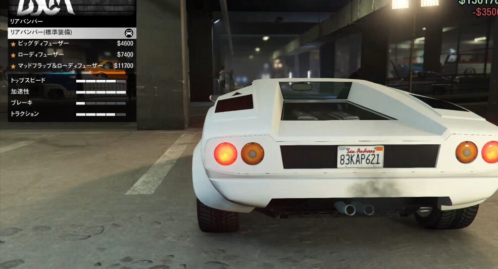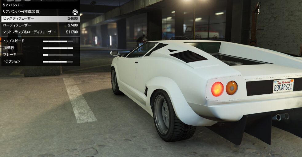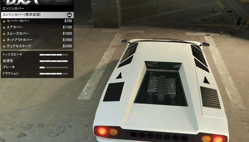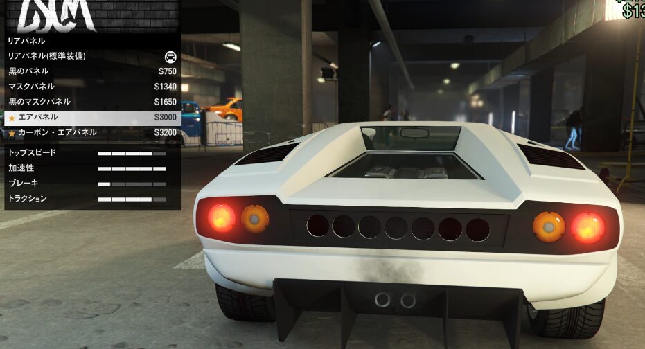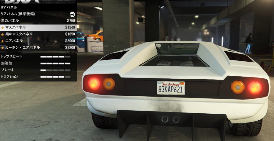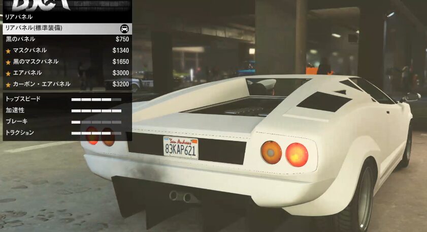 とりあえずカスタム項目の紹介をしていこう。ちなみにボディーペイントは無い。ストライプの一本も無い。