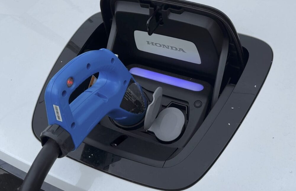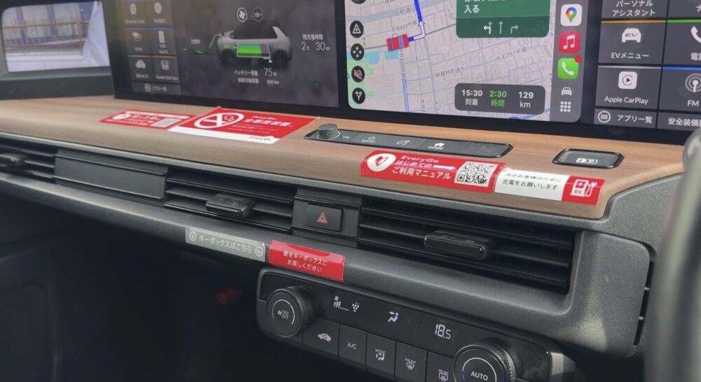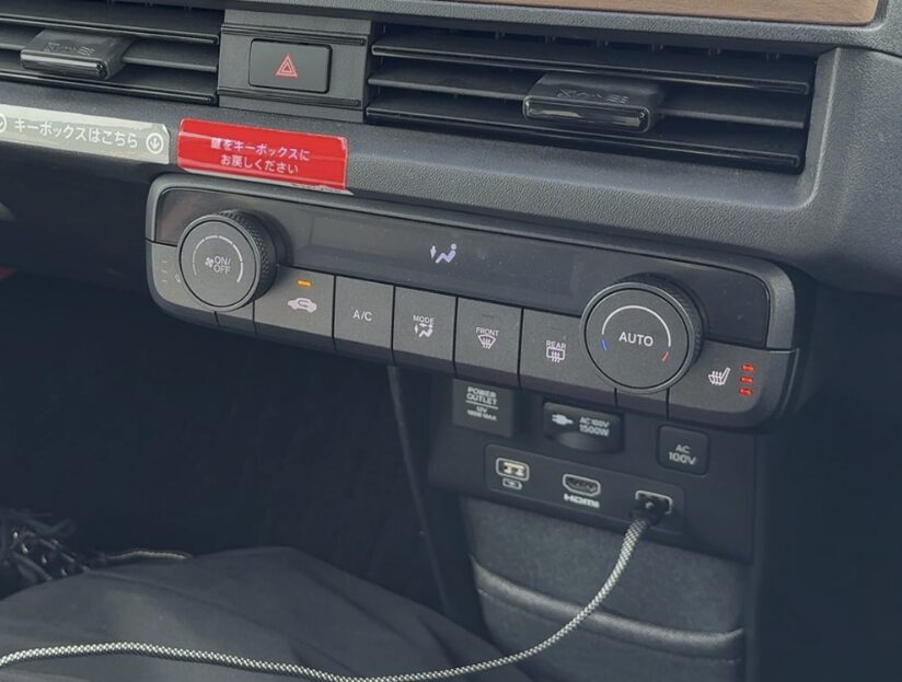 フロントの黒いところが充電ポートだが、この充電ポートはスマートキーのイジェクトボタンを長押ししないと開けられない。外から押し込んでもなぜか反応しなかった。