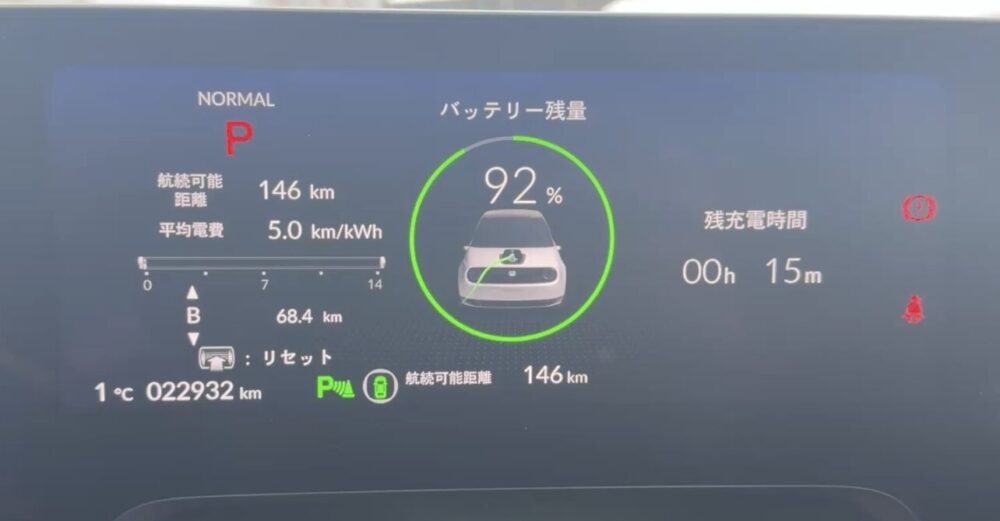 電費を5km/kwhで計算すれば150km近く走れると考えると、画面に表示されている航続距離は意外と正確だと言えそうだ。電費の伸び悩みにより、思っている以上に航続距離が無い。