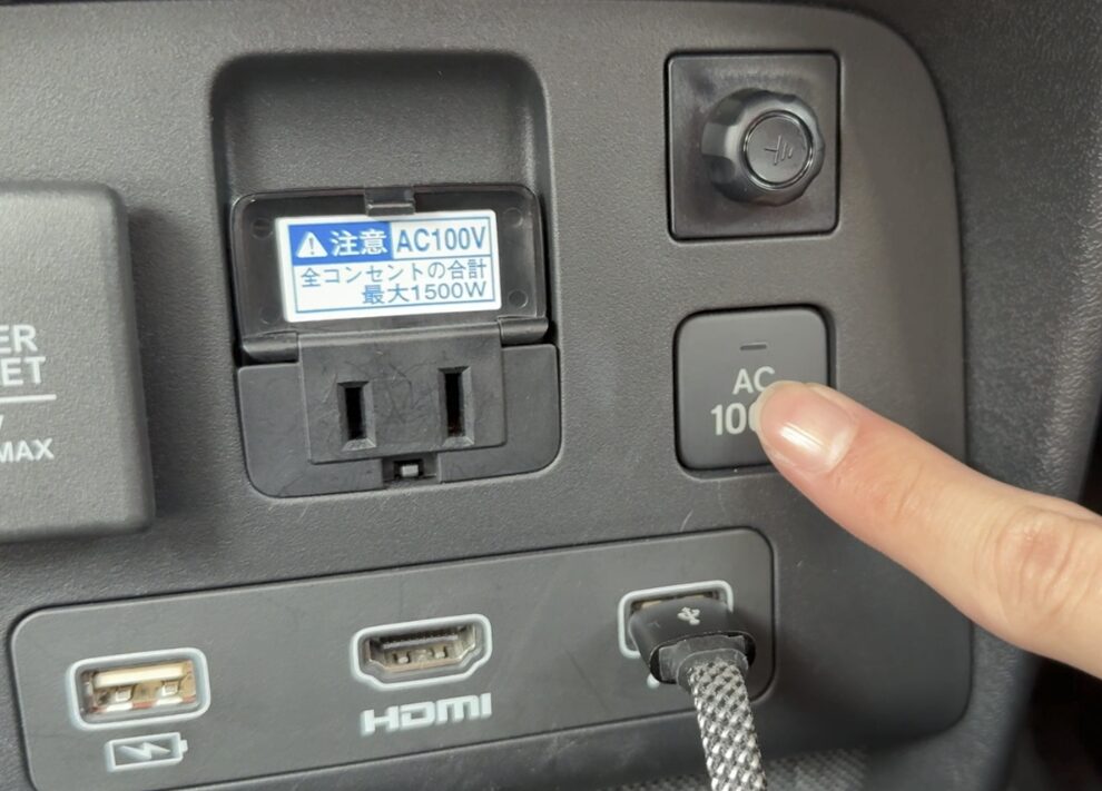 センターコンソールの奥側には1500Wまで対応するコンセント(アース付き)やHDMIポート、各種充電ポートやシガーソケット類が備わる。