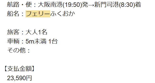 夜に大阪を出港し、翌朝に九州に到着する。