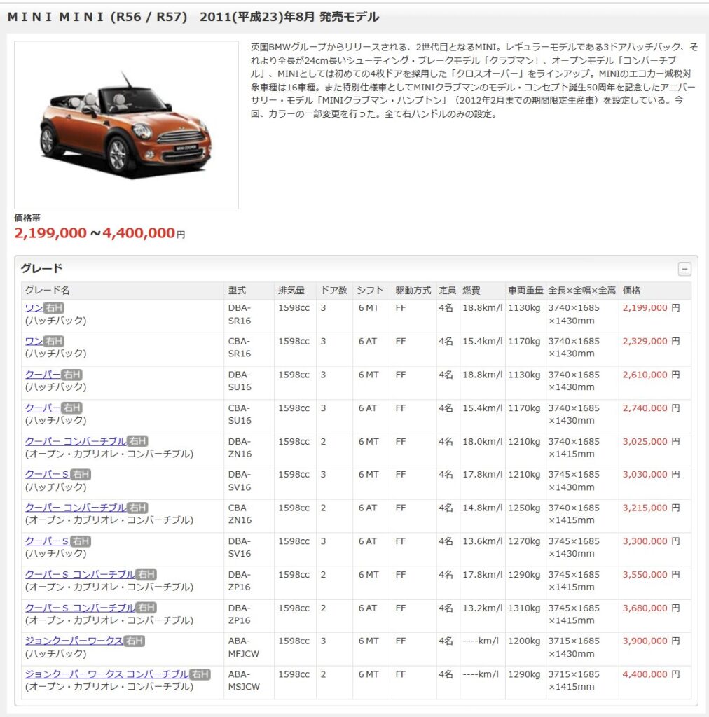 おそらく新車価格270万円のクーパーであるが、あまりにもMINIのラインナップが広すぎて具体的なグレード名が特定できなかった。