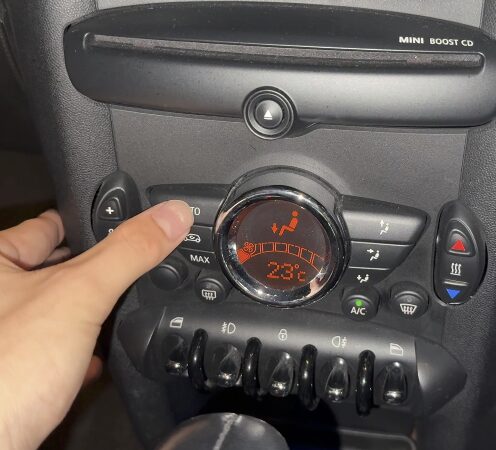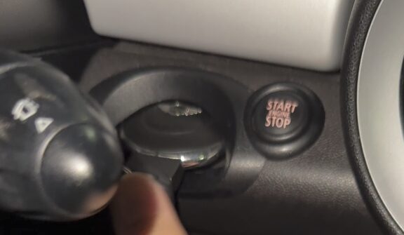 運転席右奥のスロットに鍵を押し込んで、スタートボタンを押してエンジンを掛ける。
