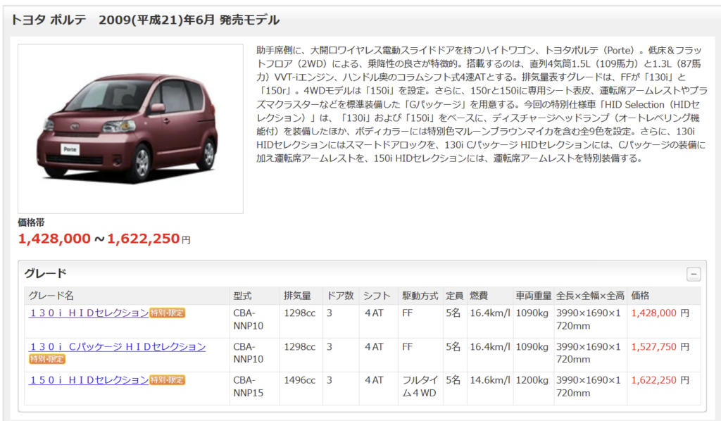 「130i HIDセレクション」は、初代トヨタ・ポルテ(NNP10型)に設定された特別仕様車で、ベースモデル「130i(1.3L FF)」に快適装備や人気装備を加えたお買い得モデルです。