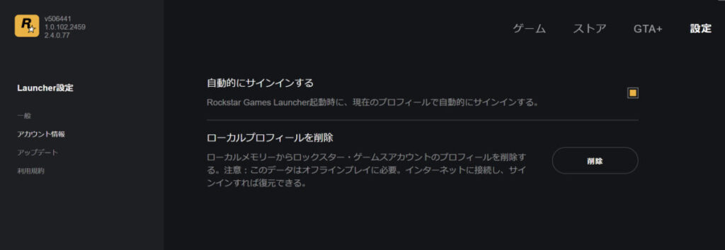 こんなときはRockstar Games Launcherの中の右上の設定メニューからローカルプロフィールを削除してみよう。
