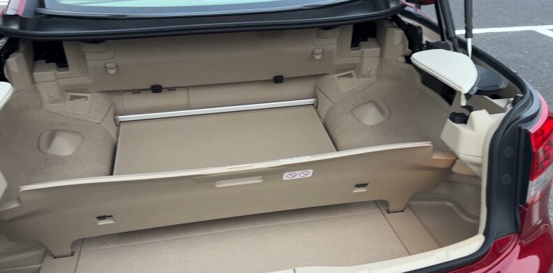 屋根を畳むスペースを荷物室として使うための仕切りがあるが、何か所もある左右の複雑なツメをしっかりとハメ込まないとエラーが起きて屋根を開けられなくなる。