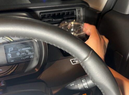 カップホルダーは両脇のみ。この位置は空調で冷やしたり暖めたりできるが、わずかに遠いため走行中に取るのが面倒くさい。