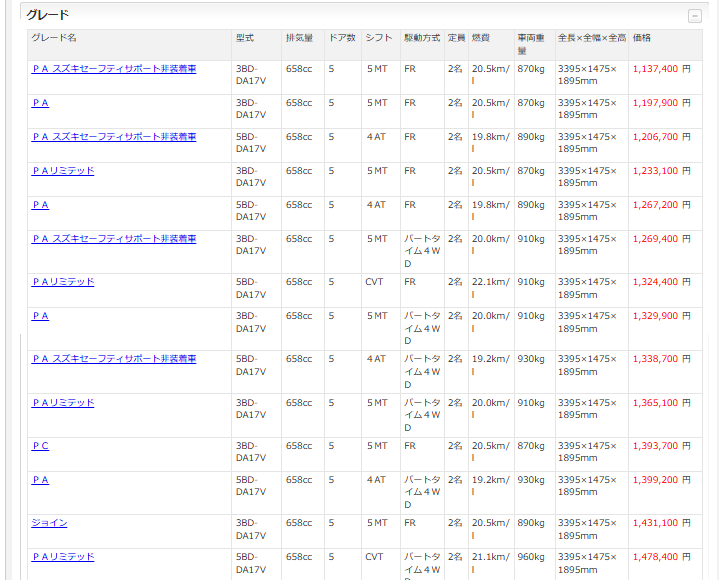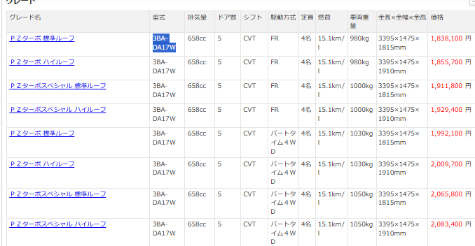 以下はエブリイの方のグレード早見表。