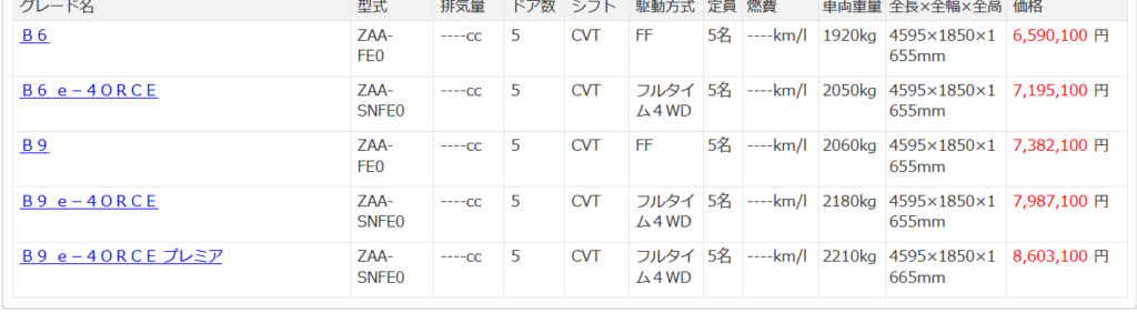 | B6 e-4ORCE | 66kWh | AWD | 250kW(340ps) | 560Nm | 約2,120 |