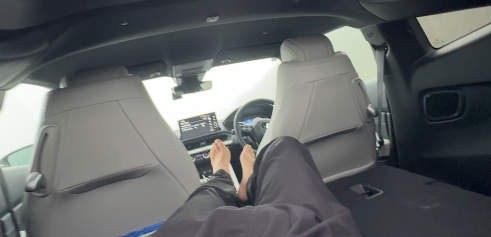 二列目を倒して荷室を前後に広げて寝そべってみると、一列目のアームレスト部に足を投げ出す形になる。