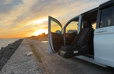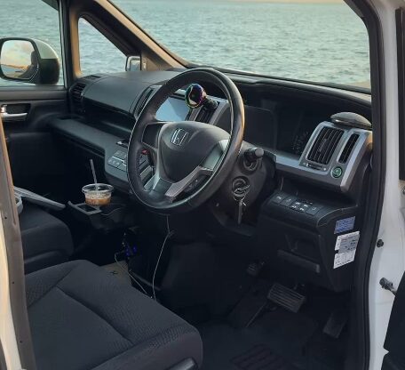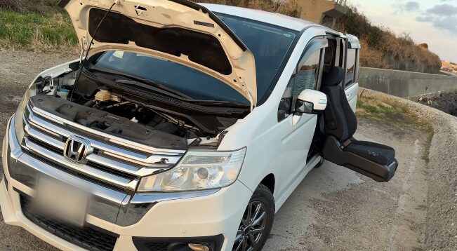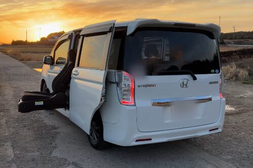 ステップワゴン、スパーダのSの、サイドリフトアップシート車に乗っていく。