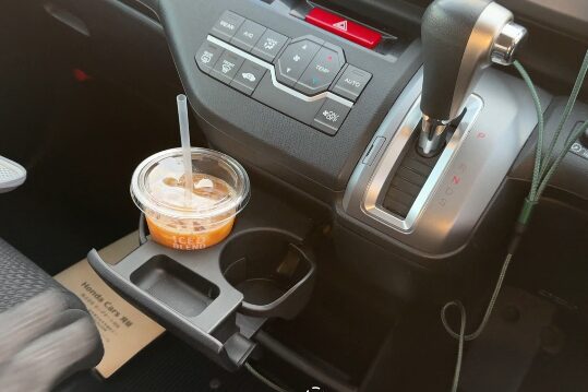 ドリンクホルダーはキャップ置きが付属する賢いタイプ。