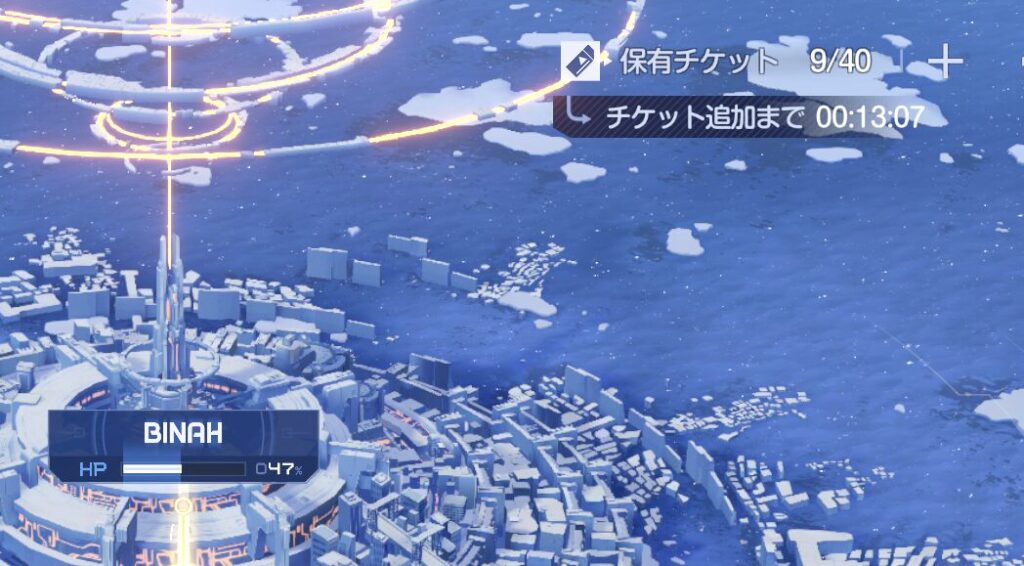 「次の1枚が回復するまでの残り時間」は、画面右上の保有チケットのあたりをタップすると表示される。下の画像の場合は13分。