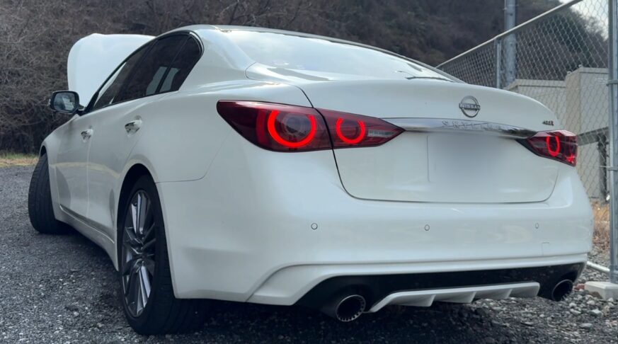 いつぞやの年次改良でGT-R系の四角いグリルと、スカイライン定番の丸目四灯テールになった。